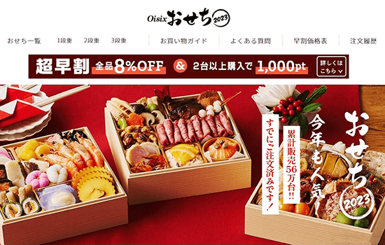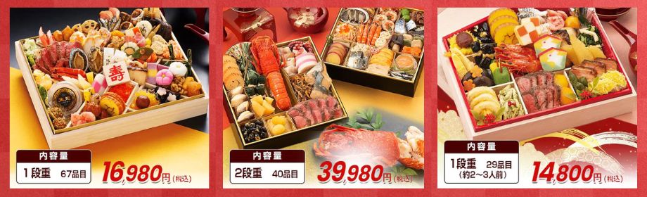 しかし、ラインナップが少なく、1万円引きになる早期割を適用しても2段重で19,980円なので、もともとの価格設定がかなり高め・・・。